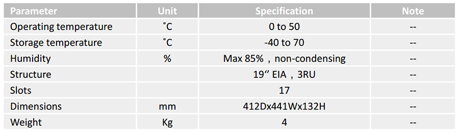 The GSDT-CH is a standard 19-inch width chassis. The chassis is 3 rack units high and has 17 slots toaccommodate all modules. A back plane interface can provide inter-module communication andpower distribution.