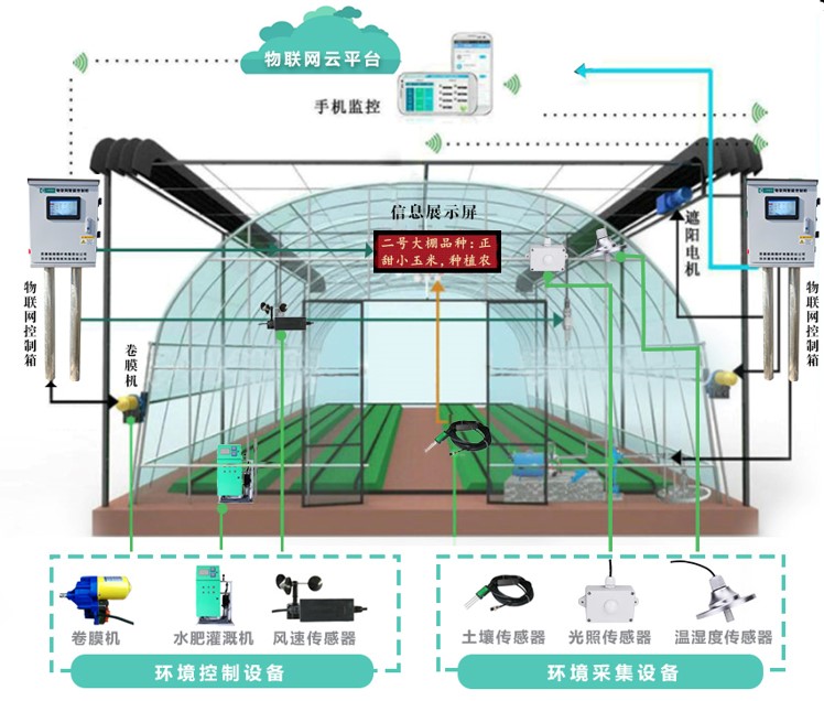 利用物聯(lián)網(wǎng)+云平臺的方式,實時監(jiān)控農(nóng)業(yè)大棚內(nèi)的溫濕度、光照強度等環(huán)境數(shù)據(jù),并上傳云平臺。遠程大數(shù)據(jù)分析并自動開啟環(huán)境控制設(shè)備(卷膜機、噴灌器等),實現(xiàn)精細化管理,以“智能代替人工” 。